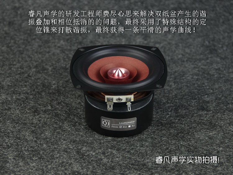 这款新全频单元,睿凡是做足了功课,才蓄势待发。首选是磁路系统,双磁防磁结构+短路环铜套,从起点就解决了中高频的透彻性。音盆的选择更是费尽心思,从各种材料入手尝试,棉、麻、树皮、竹木、玻纤、防弹布多大有些想不起了。最后研究分析了达尼的鼓纸成分,确实有独到之处。但是达尼的配方适合中低频单元,要做全频必须的下功夫改良。通过N次调整试验,效果总算征服了我的耳朵。中高频密度感很好,非常透彻,背景干净。